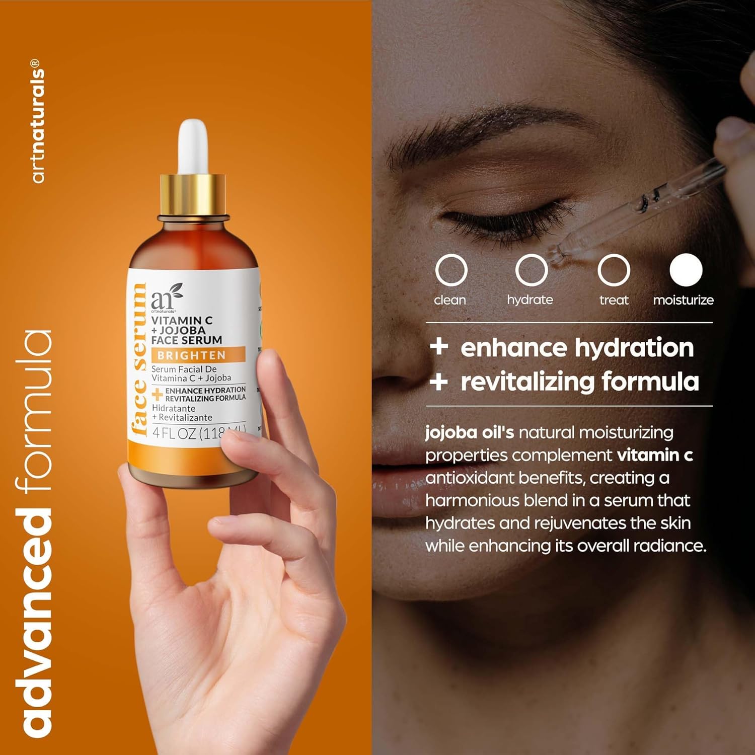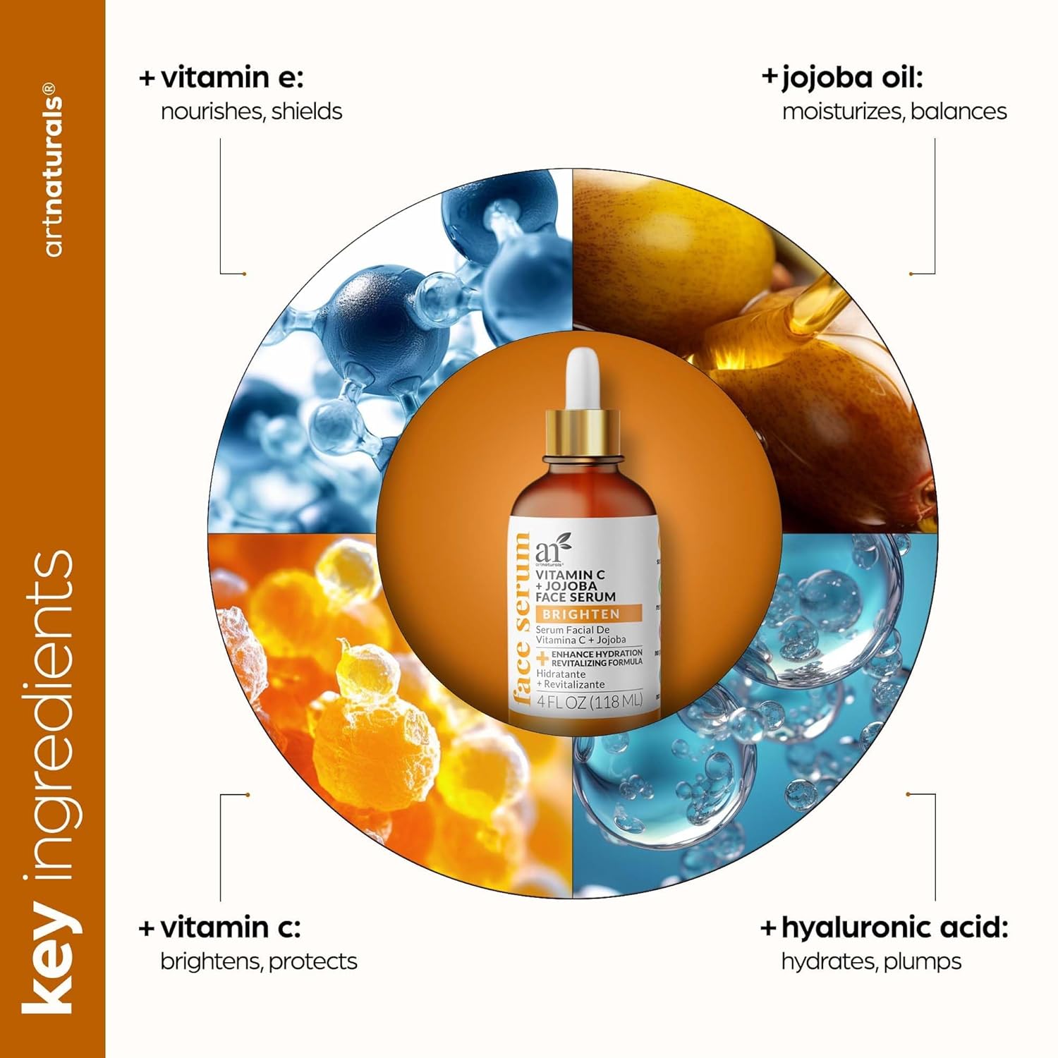 Our Anti-Aging Vitamin C + Jojoba Serum is formulated by experts to provide multiple benefits. With 4 Fl Oz of serum infused with Hyaluronic Acid and Vitamin E, it boosts collagen production, providing firmer and smoother skin while reducing the appearance of fine lines and wrinkles. The high concentration of Vitamin C acts as a powerful antioxidant, protecting the skin from environmental stressors. Jojoba oil deeply hydrates and moisturizes, promoting a youthful glow.